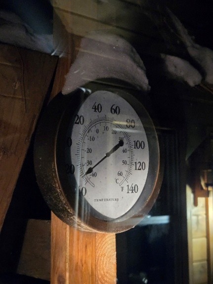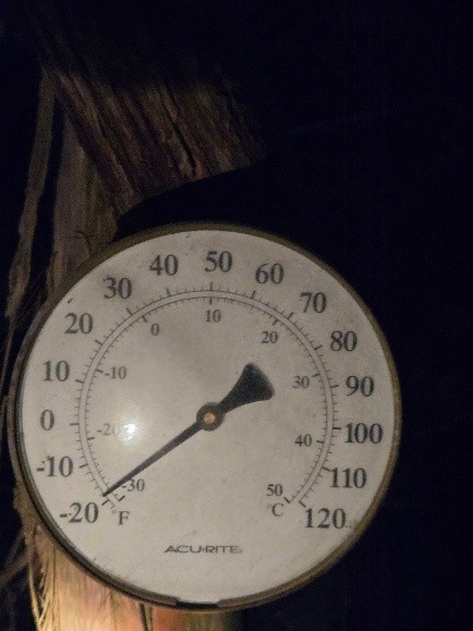 already passed. I remember wondering about a disagreement in the Treehouse thermometers. The one on the east side had bottomed out and was reading -19F at daybreak (Photo 1). The one on the west side may also have been bottomed out and read -31F (Photo 2), but I considered that to be impossibly cold and thought that the thermometer must not register properly at those end-of-scale temperatures. Someone in the town of Marion let me know that their thermometer read -20F. So, I assumed that the real temperature at the Treehouse must have been -23F ish. The Treehouse is generally about 5 Fahrenheit degrees colder than Marion. Later in the week, I stepped into the warm house of my farming neighbor for a bit of conversation. Their thermometer had registered -25F on the cold day. That was that range we were dealing with. There was also a bit of wind layered on top of the raw temperature. True winter cold.